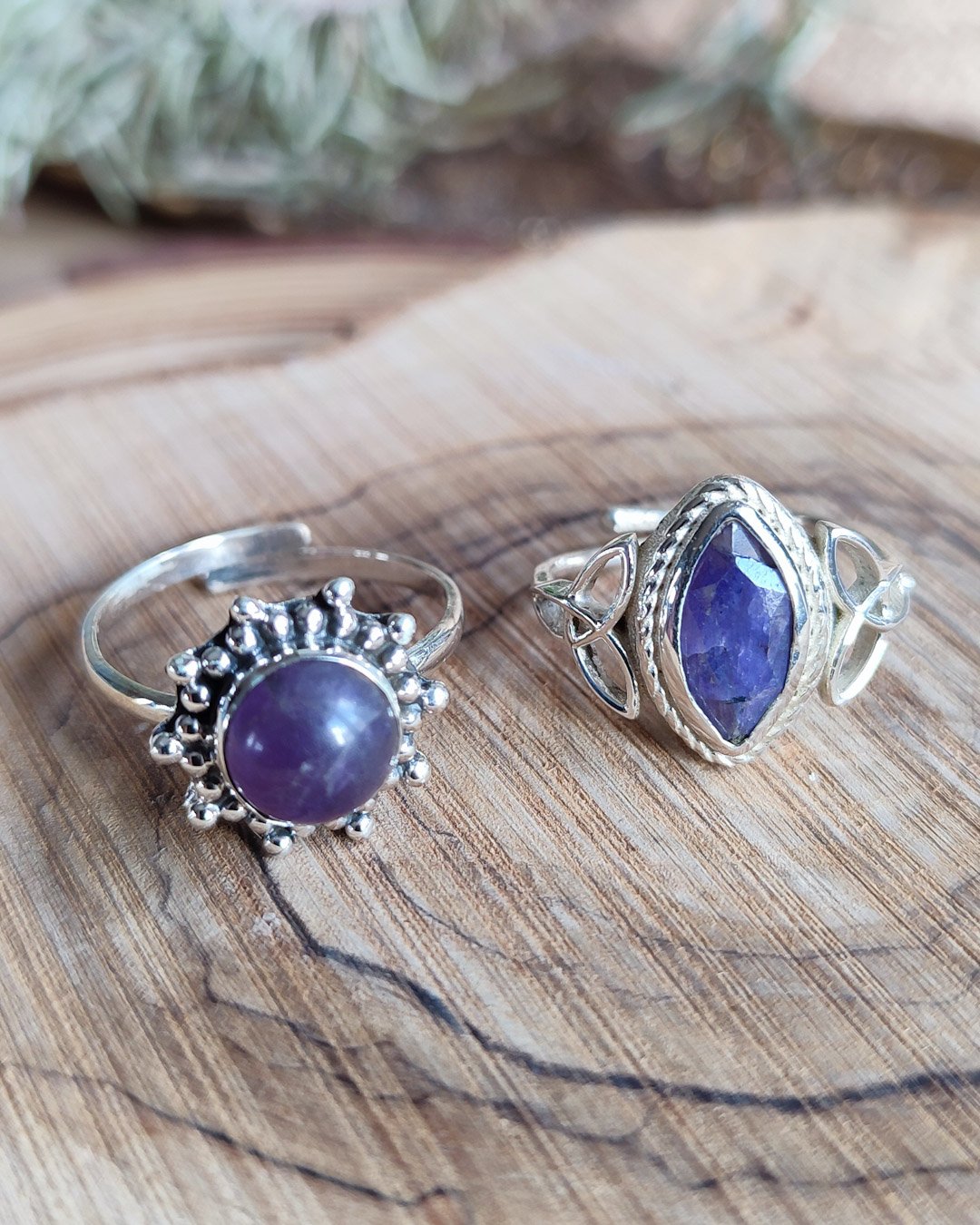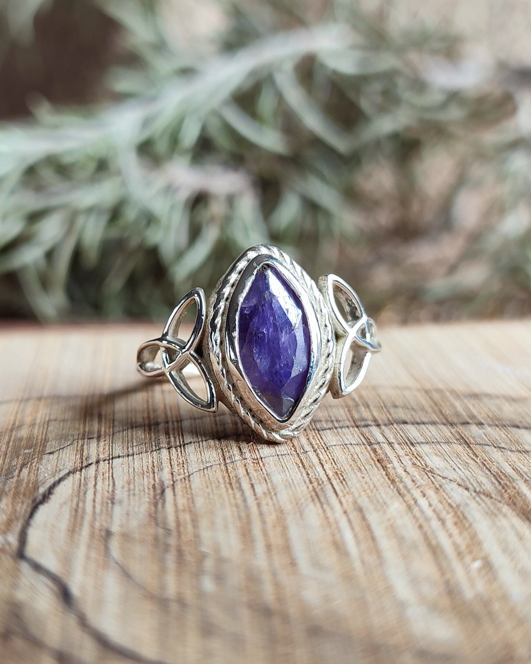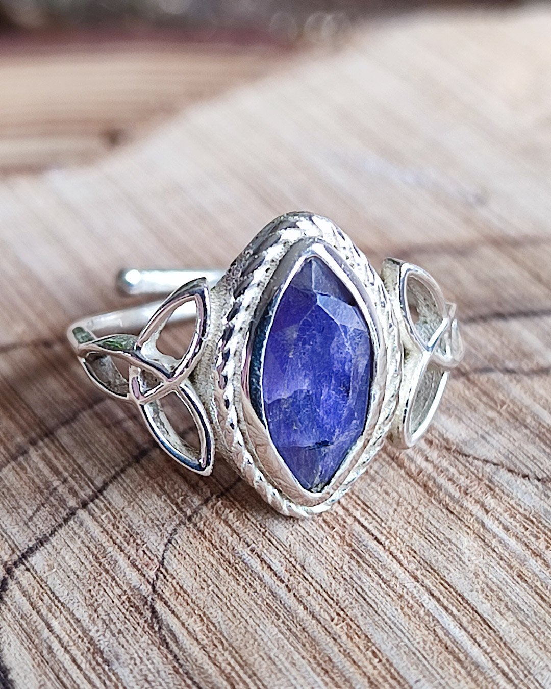 Anillo regulable de Plata de 1ªLey con símbolos de triquetas y piedra natural de Zafiro: es conocido como la piedra de la sabiduría. Calma la mente y la libera de tensión. Aporta paz y serenidad, atrae prosperidad y facilita la autoexpresión. Metafísicamente, se asocia con la sabiduría, la claridad mental, la protección y la fidelidad.