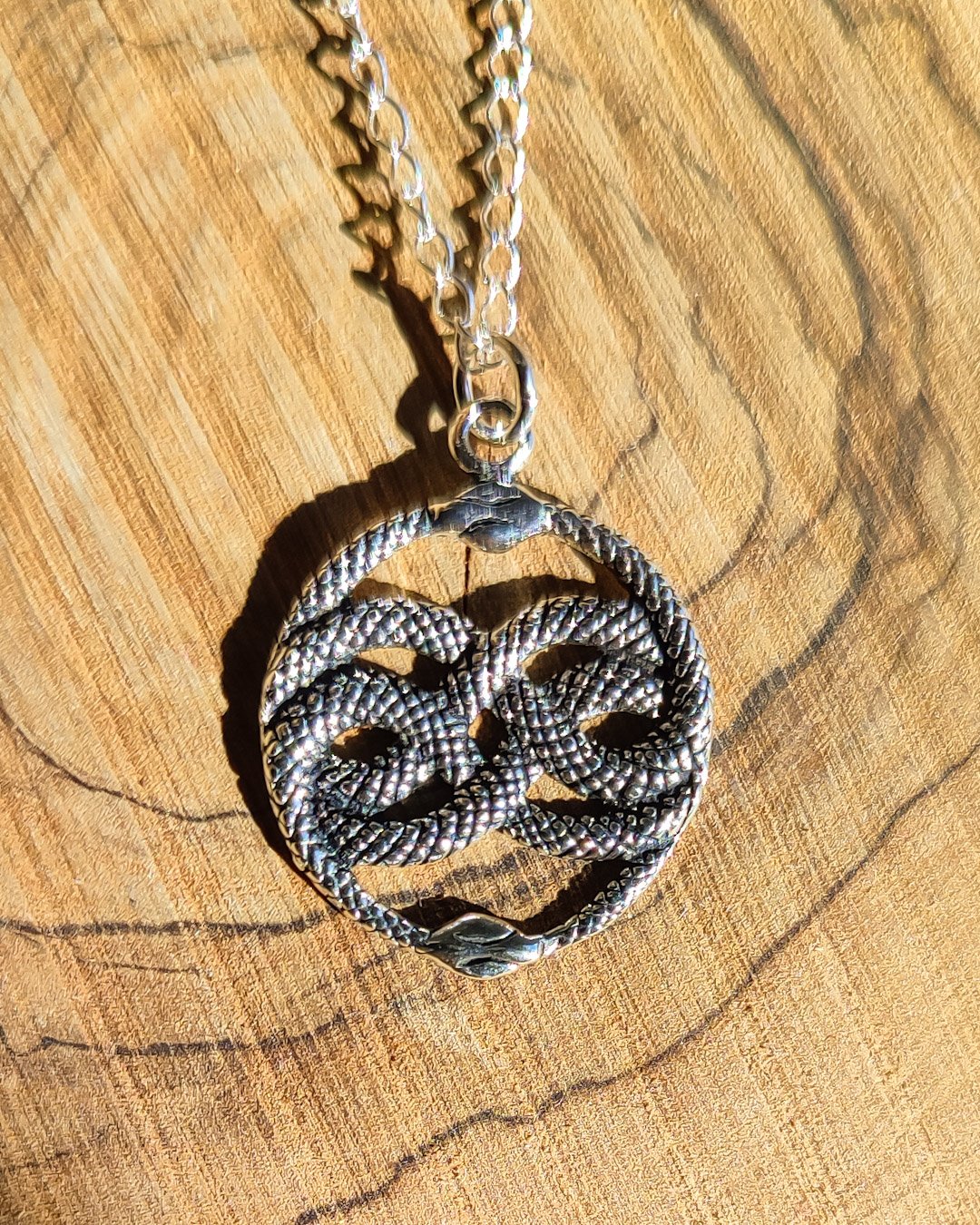 Collar de Plata de ley compuesto por un colgante Wuivre celta: un símbolo celta que representa dos serpientes entrelazadas dentro de un círculo, simbolizando la fuerza y el poder de la Tierra, la unión y el amor, a menudo asociado con amuletos de protección, y popularizado por la película La Historia Interminable como el talismán Auryn que otorga poder y protección a su portador. Con cadena de plata italiana de 45cm.