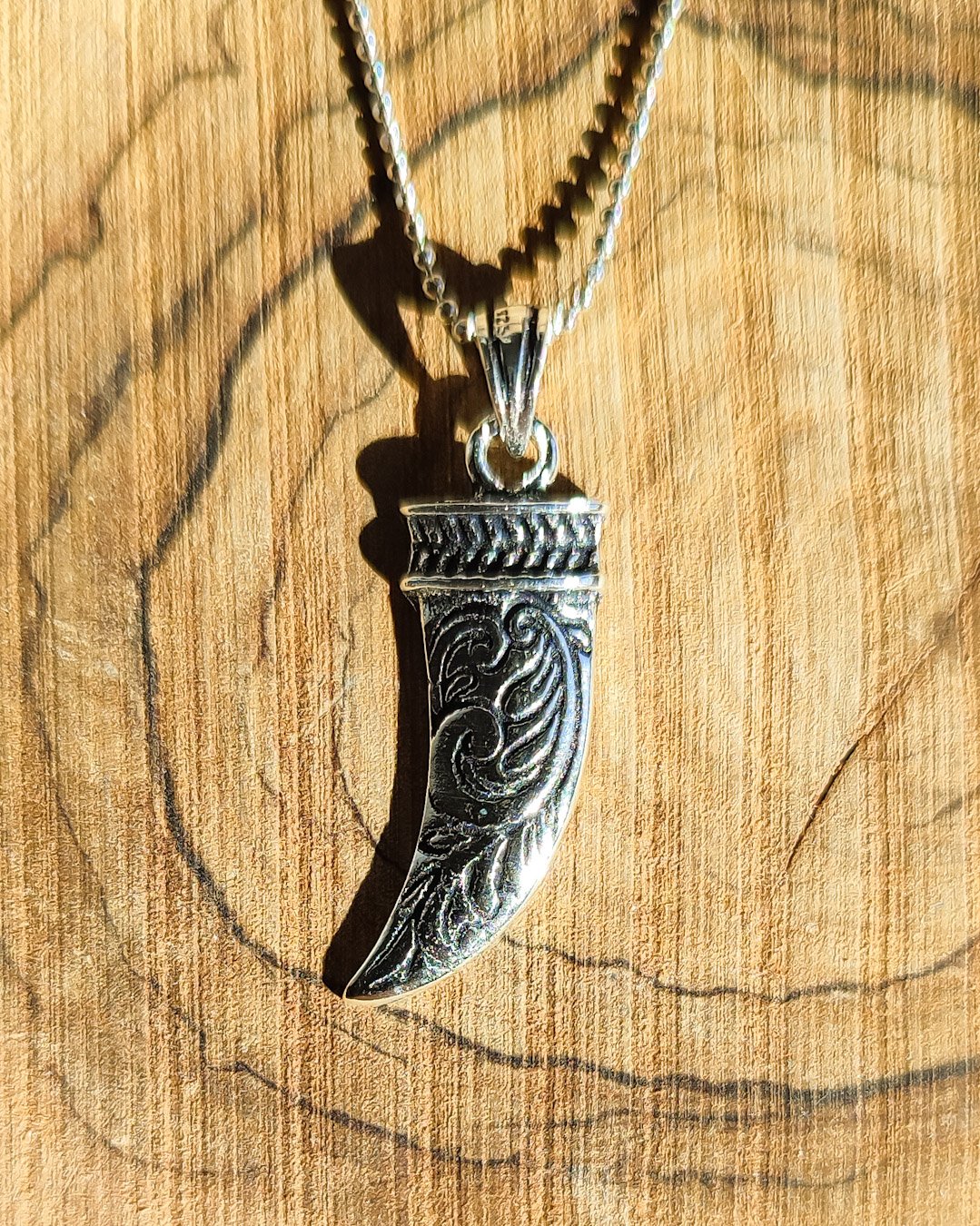 Collar de Plata de Ley compuesto por colgante labrado de Gjallarhorn: (Cuerno Resonante) es un icónico cuerno de la mitología nórdica, portado por el dios Heimdallr. Heimdallr, el guardián de Asgard, vigila el cuerno, que se dice está escondido bajo una raíz del árbol Yggdrasil. El sonido del Gjallarhorn convoca a los dioses y guerreros a la batalla final del Ragnarök, haciendo que sus ecos se oigan en todos los rincones del cosmos.