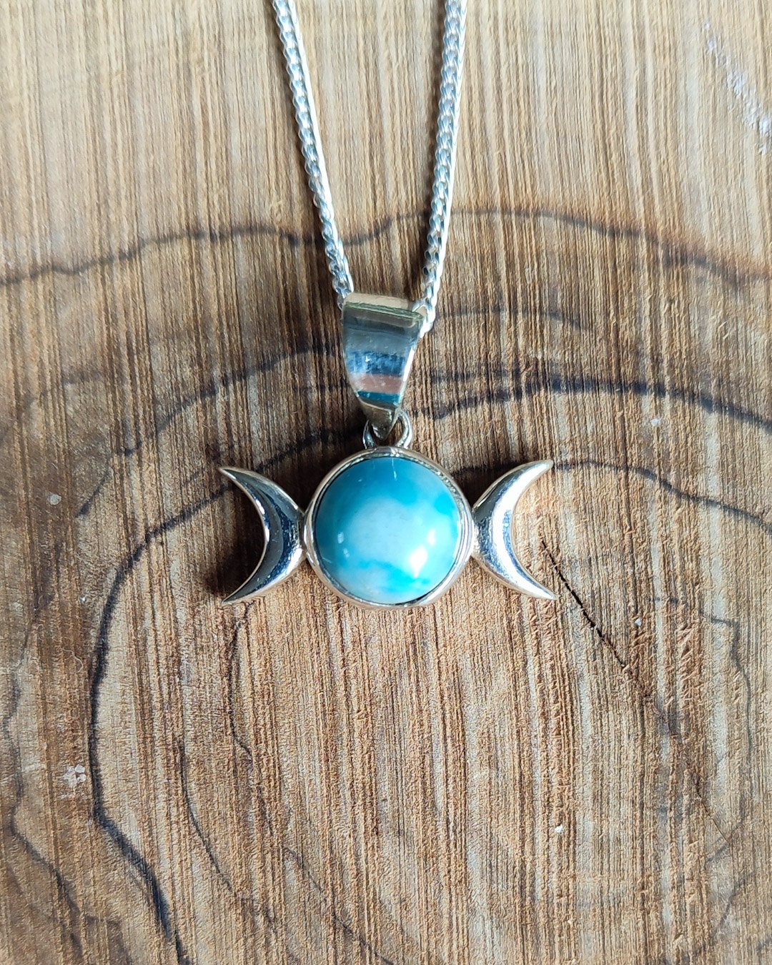 Collar de Plata de 1ªLey, compuesto por colgante en forma de Triple Luna, con piedra natural de Larimar, y cadena italiana de 45cm.