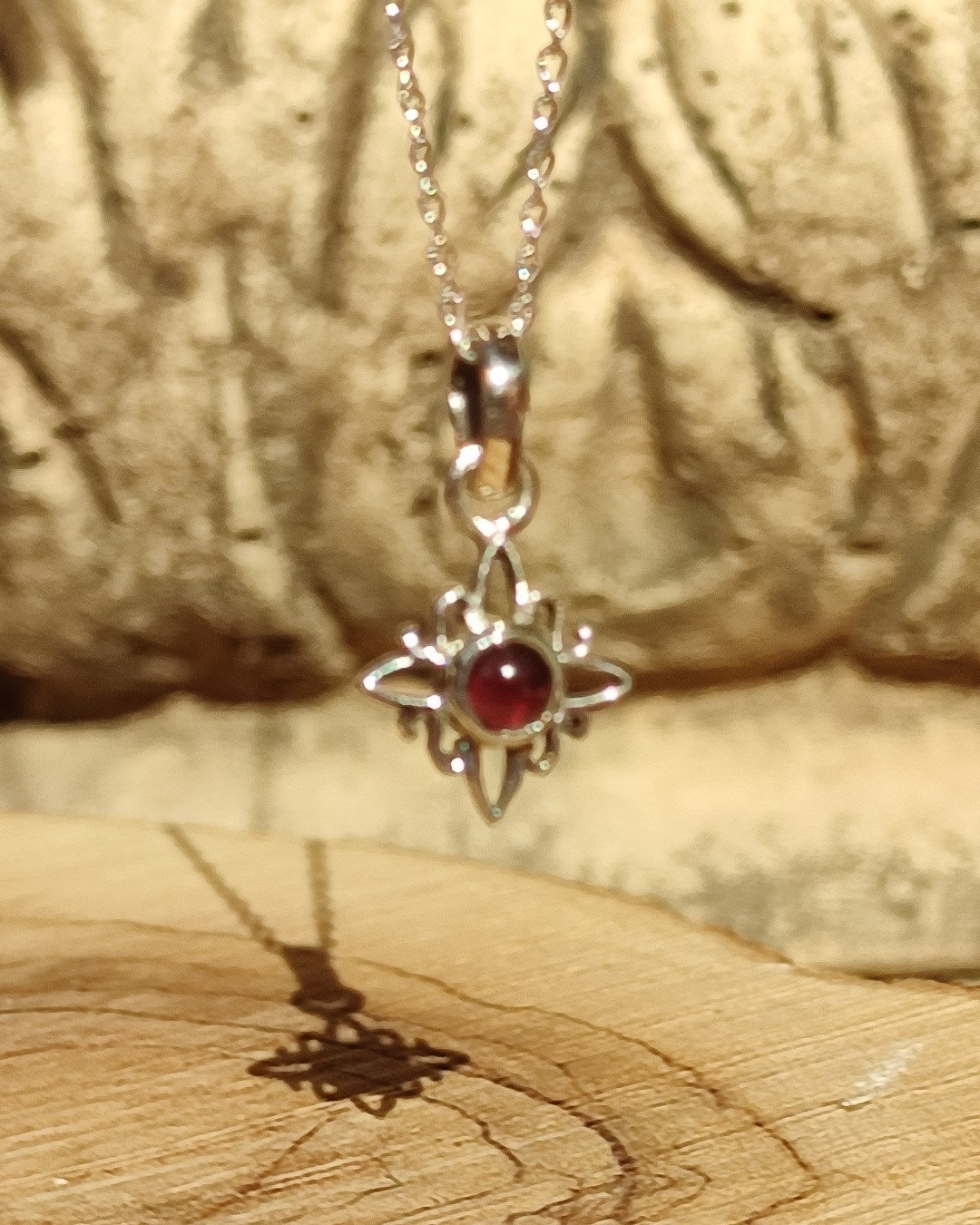 Collar hecho a mano en plata de Ley, en forma de Nudo de Bruja ( amuleto muy protector) y granate natural, con cadena italiana de 45cm.