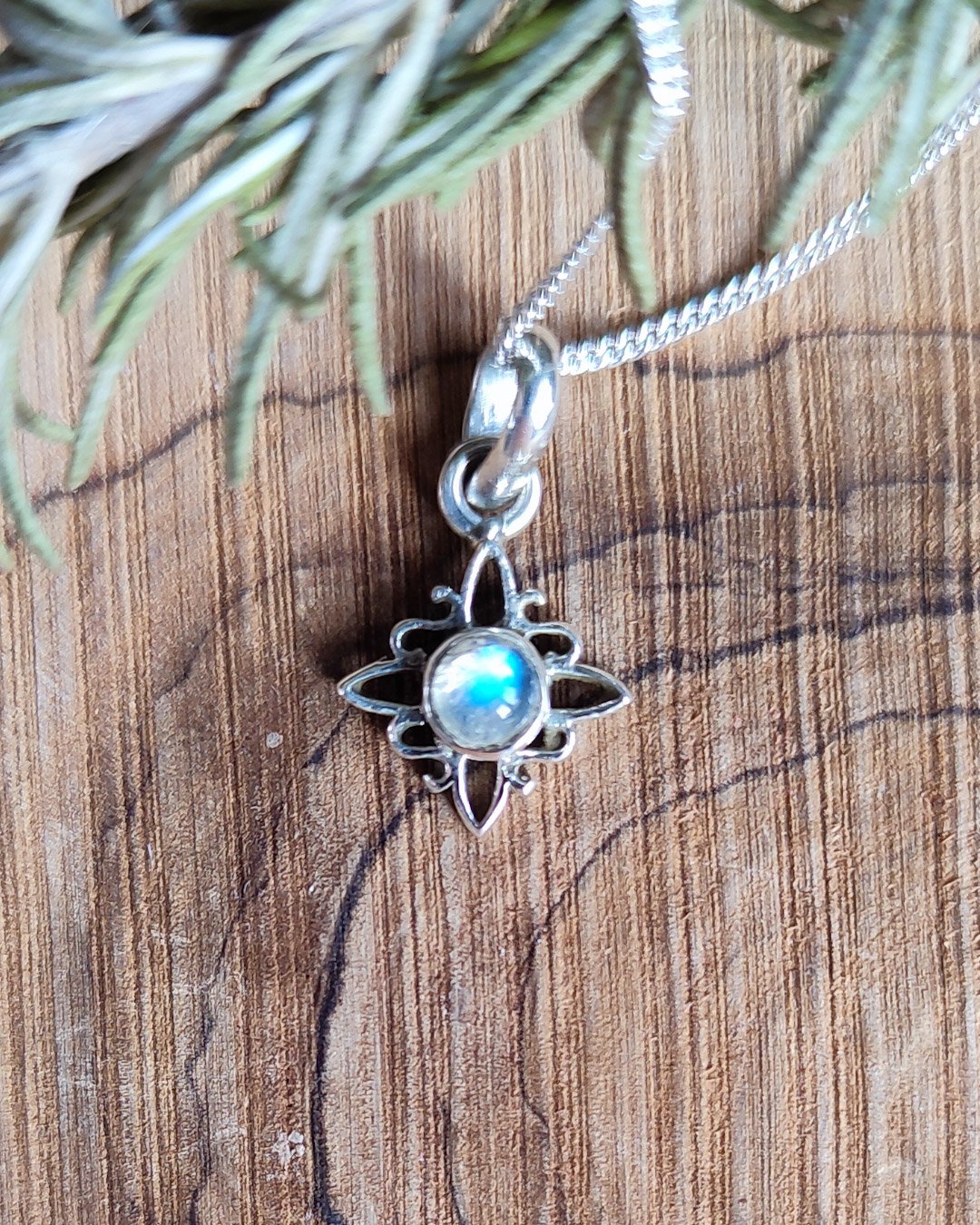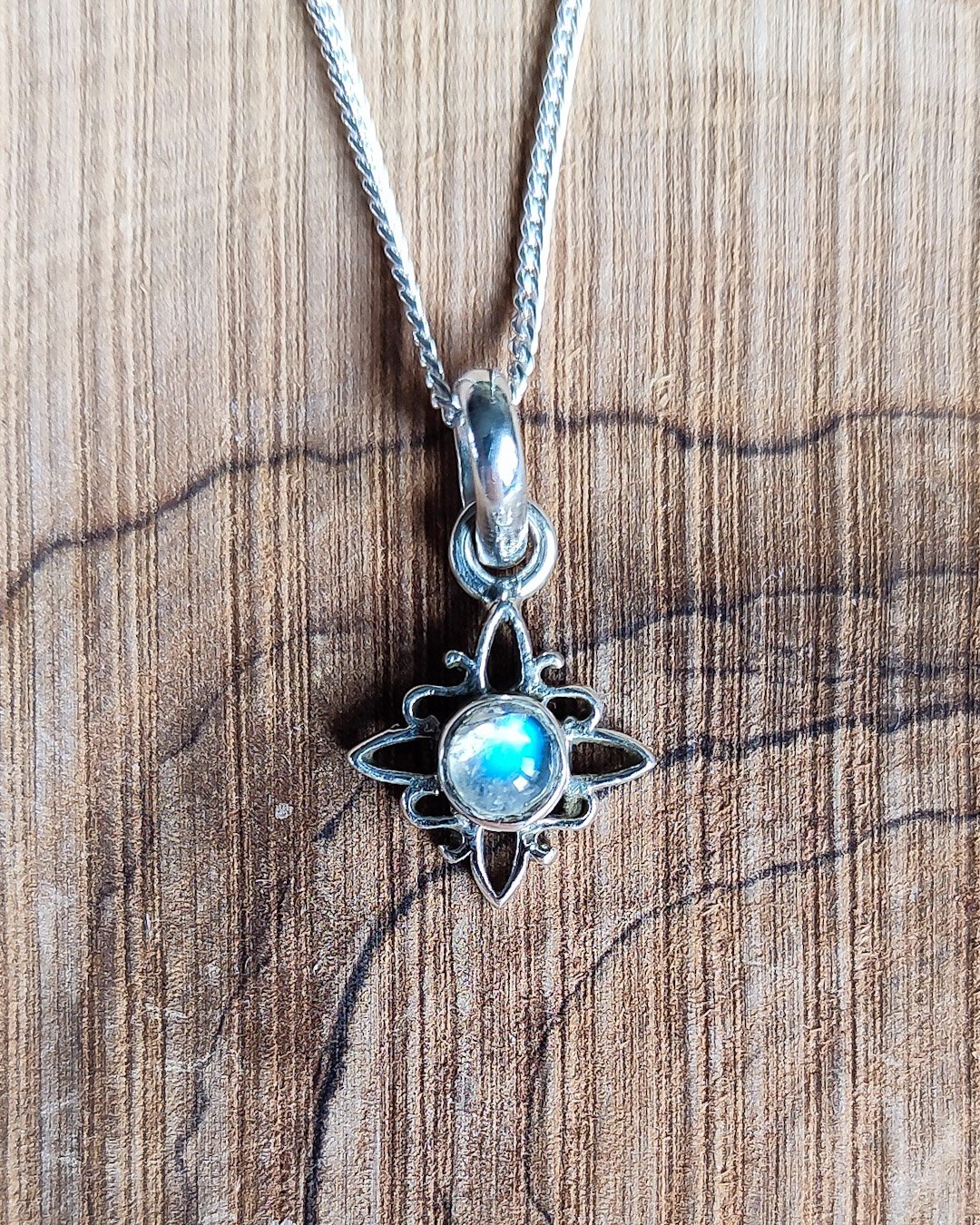 Collar hecho a mano en plata de Ley, en forma de Nudo de Bruja ( amuleto muy protector) y piedra luna natural, con cadena italiana de 45cm.