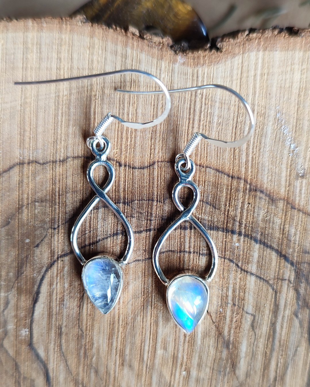 Pendientes de Plata de 1ªLey, con símbolo de infinito y lagrima invertida de mineral natural de Piedra Luna: Piedra de intuición y nuevos comienzos. También es buena para los cambios de ciclos vitales y el empoderamiento de la energía femenina. Mejora la inteligencia emocional.